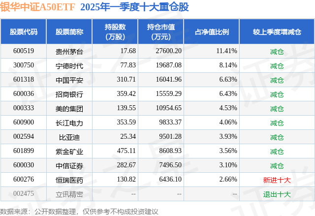 从基金规模来看,银华中证A50ETF基金2025年一季度公布的基金规模为24.19亿元,较上一期规模30.39亿元变化了-6.2亿元,环比变化了-20.39%。该基金最新一期资产配置为:股票占净值比99.04%,无债券类资产,现金占净值比1.09%。从基金持仓来看,该基金当季前十大股票仓位达54.45%,第一大重仓股为贵州茅台(600519),持仓占比为11.41%。