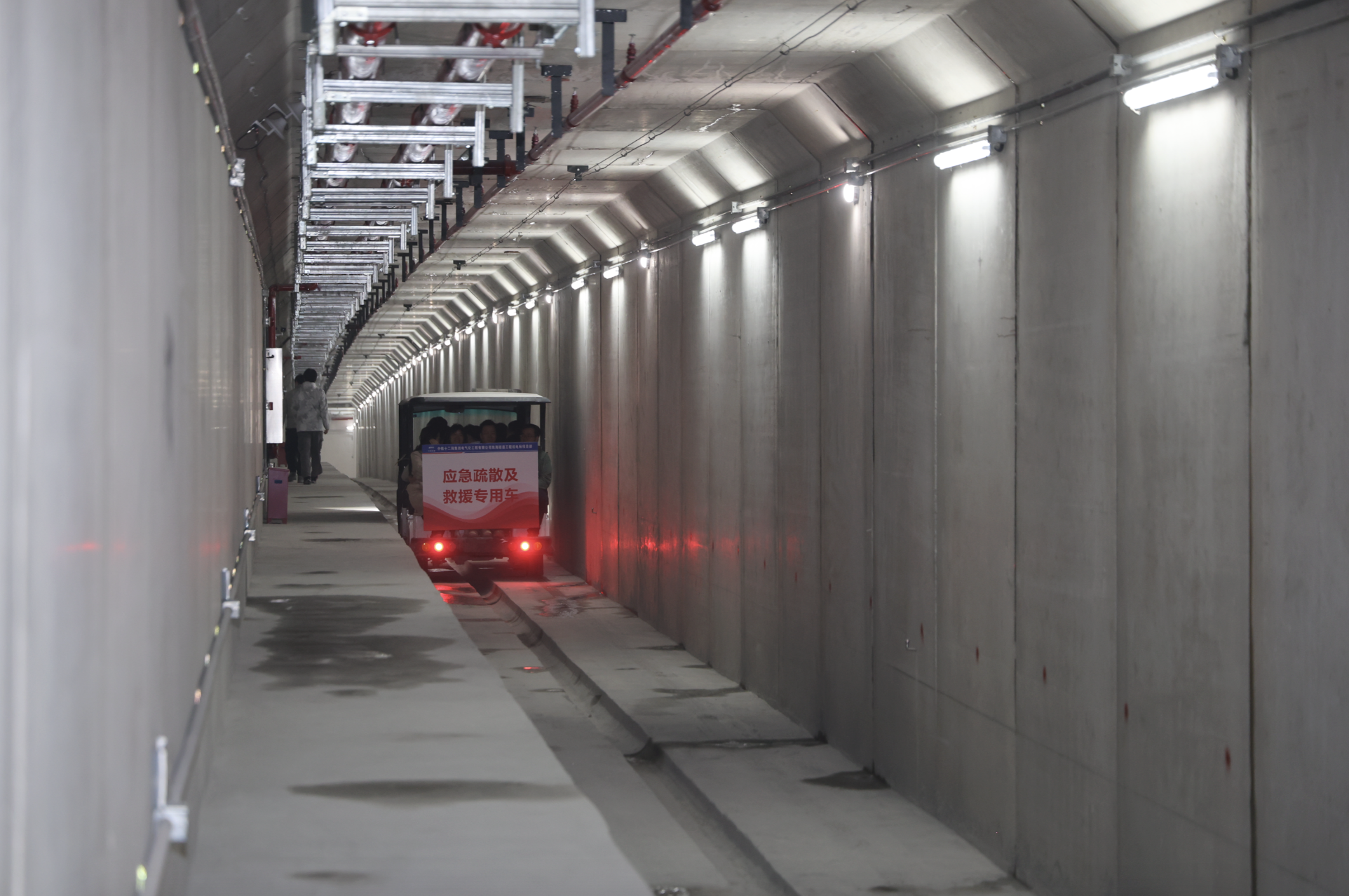 珠海隧道内部设置了29处逃生通道。图为在隧道内应急演练中,人员通过逃生通道撤离