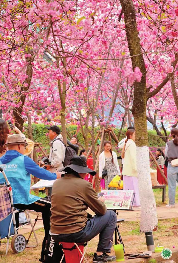 市民在樱花树下写生 昆明动物园供图